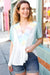 Slip on this eye-catching textured two-tone color block top featuring dolman mint cap sleeves and a lace-up neck design. With trendy out seam overlock reverse stitching and colorful stripes, this summer-to-fall style is perfect for changing temps.