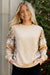 Such a cute piece! This sweater is a taupe color with an olive animal print down the sides. There is a lovely crochet lace detail on each sleeve. It is made with a soft textured knit fabric. This one will be an instant favorite.
