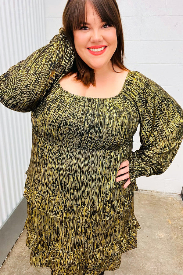 Get holiday party ready with this smocked chest gold foiled dress. Smocked cuff bubble sleeves and tiered ruffle design complete this stunner!