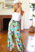 Whimsical and stunning describes this Twofer corded white knit tank top jumpsuit with side pockets, wide leg geometric patchwork pants and a tie waist. Catch glances with this stylish jumpsuit!