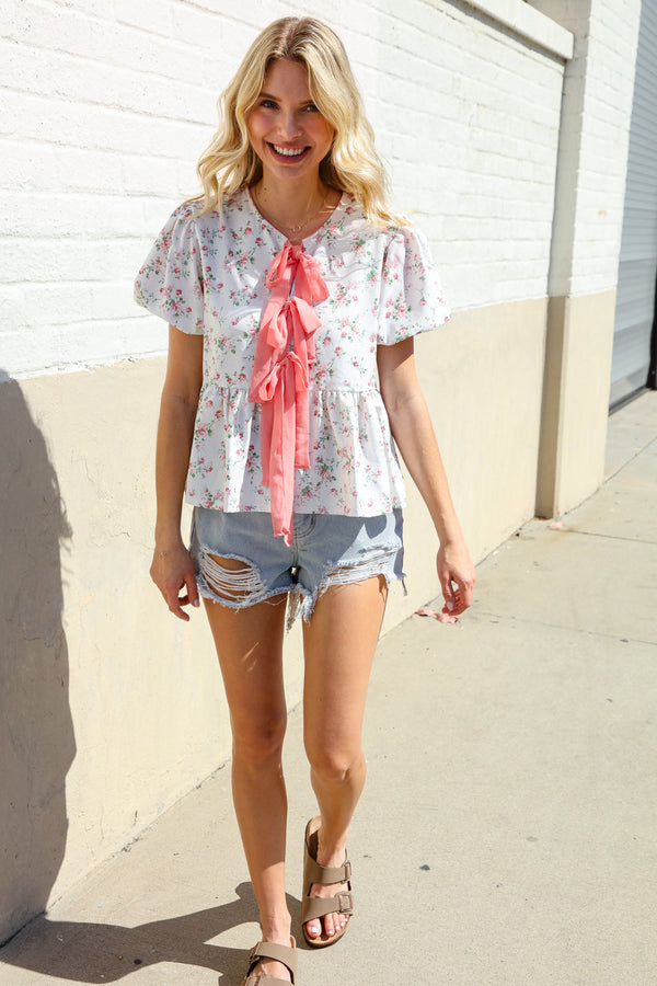 Designed with silky ribbon bow ties and a vintage floral fabric, this woven babydoll top with folded puff sleeves is versatile and will brighten up any room or occasion you wear it to. Be prepared to stun!