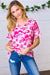 This stunning magenta and white geometric floral print top designed with banded drop shoulder short sleeves and a casual V neck will add charm to any outfit.