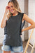 A perfect staple for summer or early fall, this charcoal sleeveless top is designed with distressed French terry, black crochet lace and a round neck. Pair with all your bottoms or skirts for a stunning look.