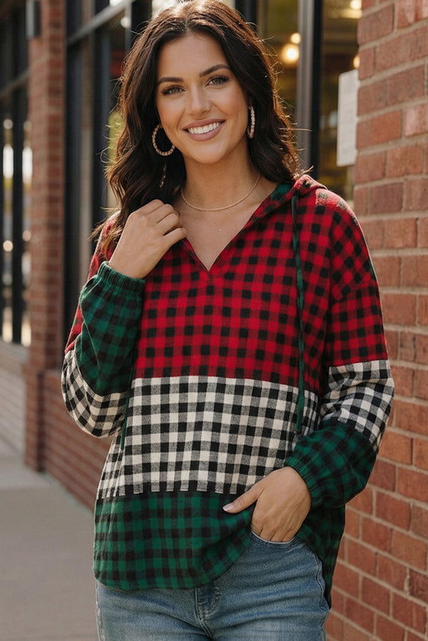 Get into the festive spirit with this cozy plaid hoodie that brings all the holiday vibes! Featuring a playful mix of seasonal checks, red, green, and classic black & white, this lightweight pullover is the perfect blend of cheerful and comfortable. The relaxed fit, soft feel, and casual hood make it an easy go to for cookie baking, tree shopping, or just sipping cocoa by the fire. Pair it with jeans or leggings and celebrate the season in style, because cozy and cute is the holiday dress code!