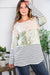 This top is such a fun mix of patterns with leopard on top, a soft olive tie dye through the middle and then classic black + white stripes at the bottom and sleeves. The material is light and has a nice stretch. It runs on the longer side.