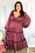 You will love this solid wine satin overlap front yoke maxi with long bubble elastic sleeves and a flattering tiered body with frill ruffle details. Stylish and versatile, this smocked square back maxi is elegant and perfect for all your holiday festivities.